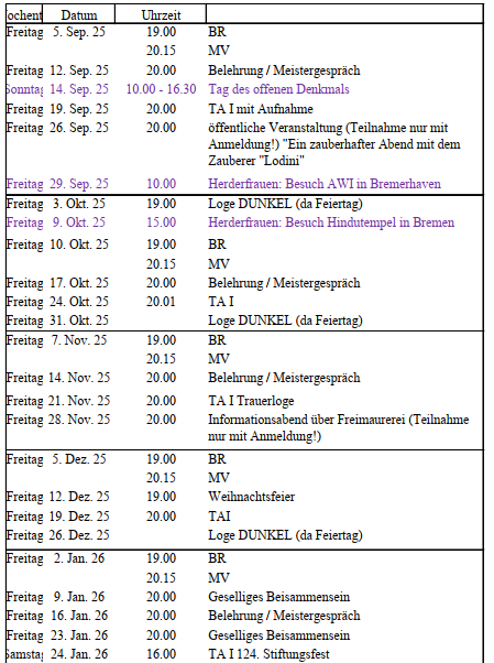 Am 14. September 2025, dem Tag des offenen Denkmals, kamen sehr viele Besucher in das Bremer Logenhaus in die Kurfürstenallee 15. U.a. führen Mitglieder der Freimaurerloge Herder die Besucher durch das Haus. Freimütig beantworten sie alle Fragen zum Huas und zur Freimaurerei. Bei weiterem Interesse, sprechen Sie uns bitte an.